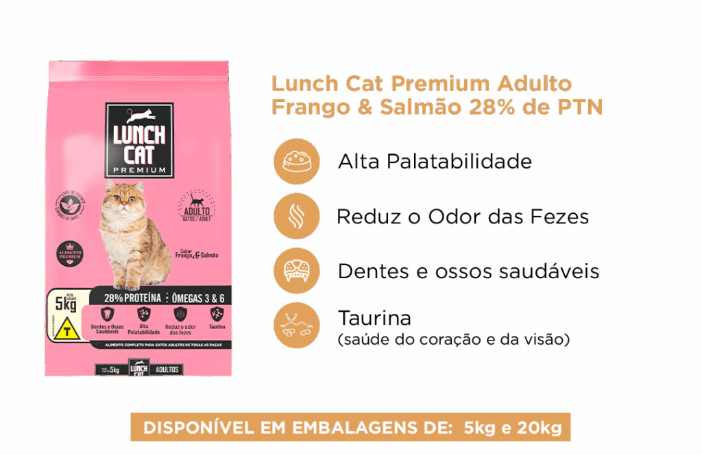 Farinha de vísceras de aves (16%), Farinha de carne e ossos bovino, milho moído integral*, quirera de arroz, gérmen de milho desengordurado*, farelo de trigo, farelo de arroz desengordurado, farinha de peixes, aroma de salmão, óleo de aves, hidrolisado de fígado suíno e de aves, óleo de peixes, cloreto de sódio (sal comum), parede celular de levedura saccharomyces cerevisiae (MOS) 0,2%, adsorvente de odor (espina corona, saponina, zeolita), adsorvente de micotoxina (aluminosilicato de sódio e cálcio 100%), sulfato de ferro, sulfato de cobre, iodato de cálcio, sulfato de manganês, sulfato de zinco, selenito de sódio, proteinato de selênio, cobre aminoácido quelato, zinco aminoácido quelato, manganês aminoácido quelato, vitamina A, vitamina D3, vitamina E, vitamina K3, vitamina B1, vitamina B2, vitamina B6, vitamina B12, ácido nicotínico, pantotenato de cálcio, ácido fólico, biotina, cloreto de colina, L-lisina, DL-metionina, Taurina, aditivo antioxidantes e conservantes (BHT, BHA, propionato de cálcio, ácido cítrico, óleo essencial de laranja).